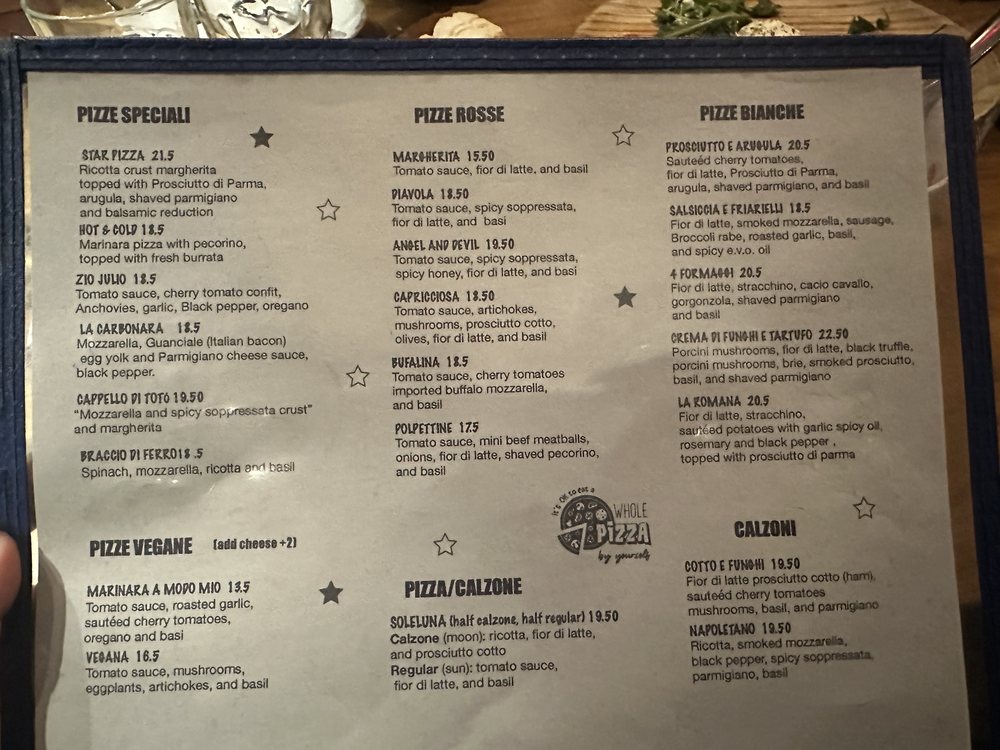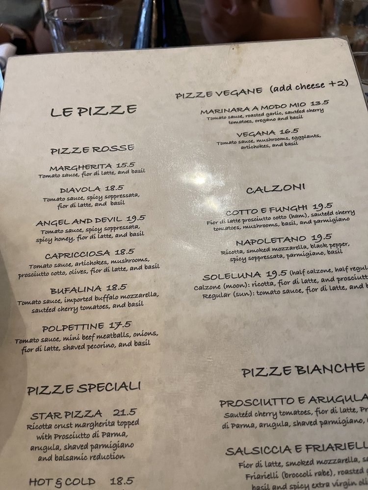 Tomato sauce, artichokes, mushrooms, prosciutto cotto, olives, fior di latte and basil.